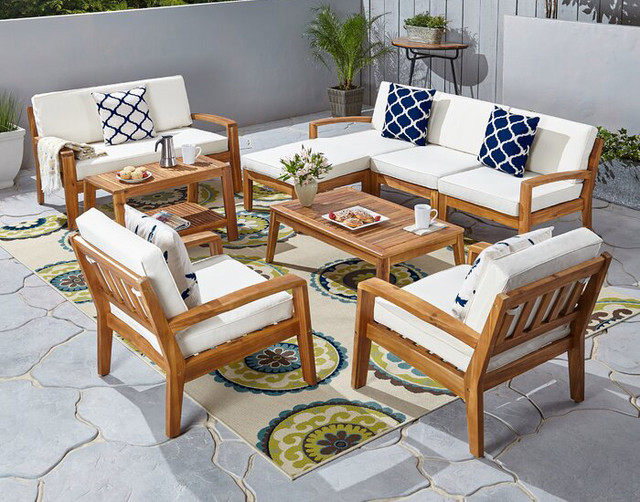 Комплект садових меблів буде для Вас ідеальним місцем проведення будь-якого заходу на відкритому повітрі або на терасі. Комплект вміщує від семи чоловік, його можна розташувати на свій розсуд, що робить його мрією для тих, хто любить індивідуалізувати свій життєвий простір. Виготовлений із цільного дерева і доповнений прекрасними атмосферостійкими подушками. При замовленні набору надаємо варіанти кольорів і візерунків подушок.